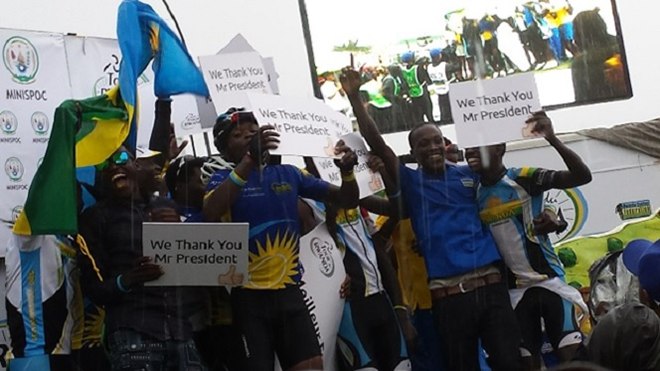 Without wasting time, in spite of the cold rainy showers, Nsengimana was already on top of the podium popping the champagne as his colleague waved placards written on “We Thank You Mr President” for he financed every single bit of what they needed, from the bikes, boots, jerseys, helmets, sunglasses and training.