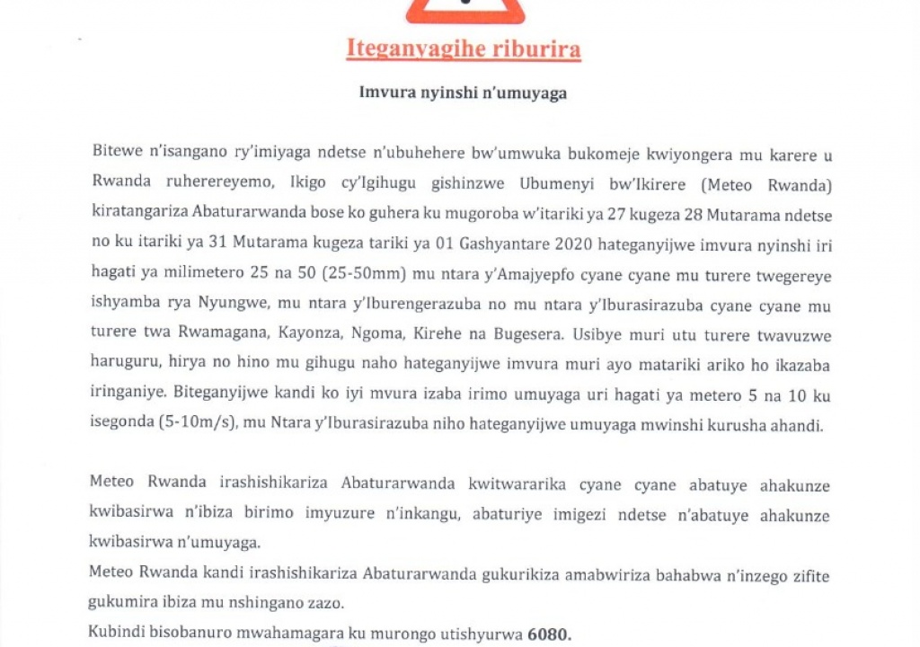 A statement released by Rwanda Meteorology Agency yesterday warned that between January 31 and February 1, a 25-50mm rain is expected in Southern part of the country especially in the districts proximal to Nyungwe National Park as well as districts bordering the park in Western part of the country.