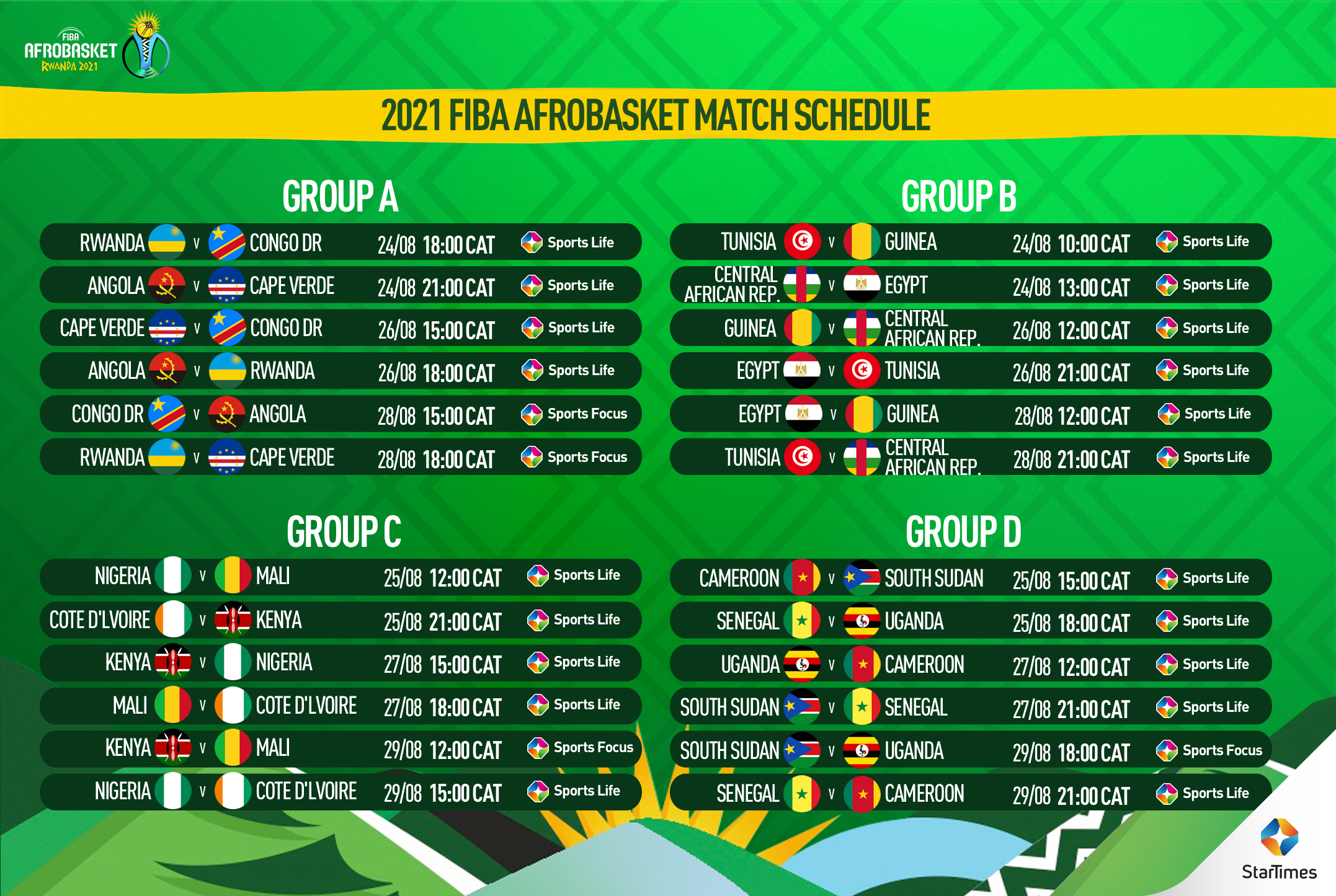 Basketball fans throughout Africa will be able to watch all the action from this year’s AfroBasket tournament live and exclusively on the StarTimes channels ST Sports Life and ST Sports Focus.