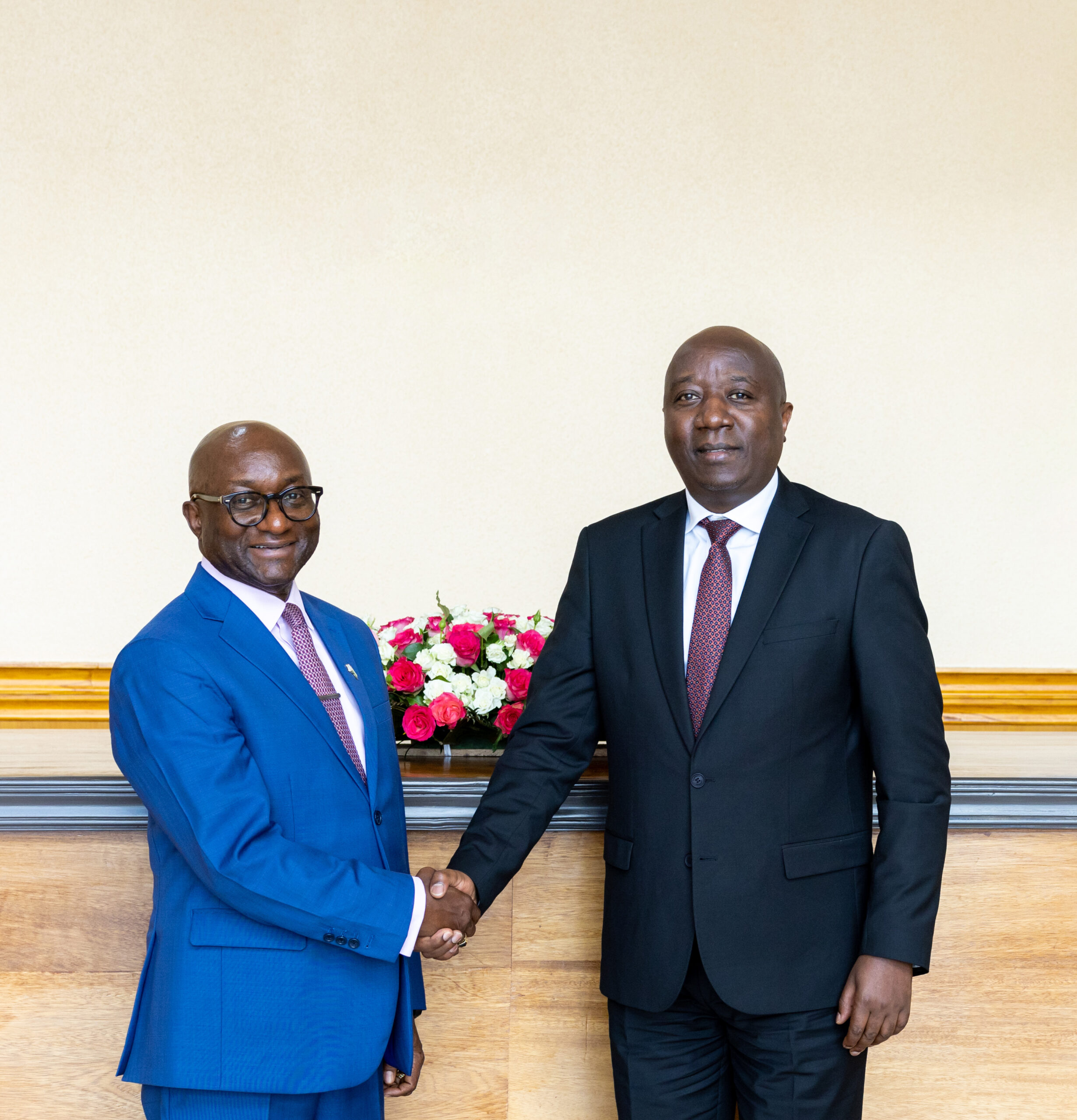 Sahr John Kpundeh (left) shakes hands with Rwanda’s Prime Minister, Dr. Édouard Ngirente after the courtesy call held at the Office of the Prime Minister, this March 8, 2024.