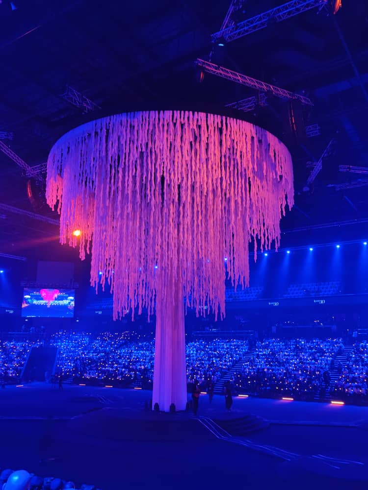 There are no arrows pointing you to where you need to go, as you enter the arena, just those innately welcoming young people, an army of them. Once inside, what is normally the basketball court is transformed. At its centre a giant luminescent scupture, in the shape of a tree, made out of white remembrance ribbons. If you have ever wondered what stories trees could tell, this one has much to say.