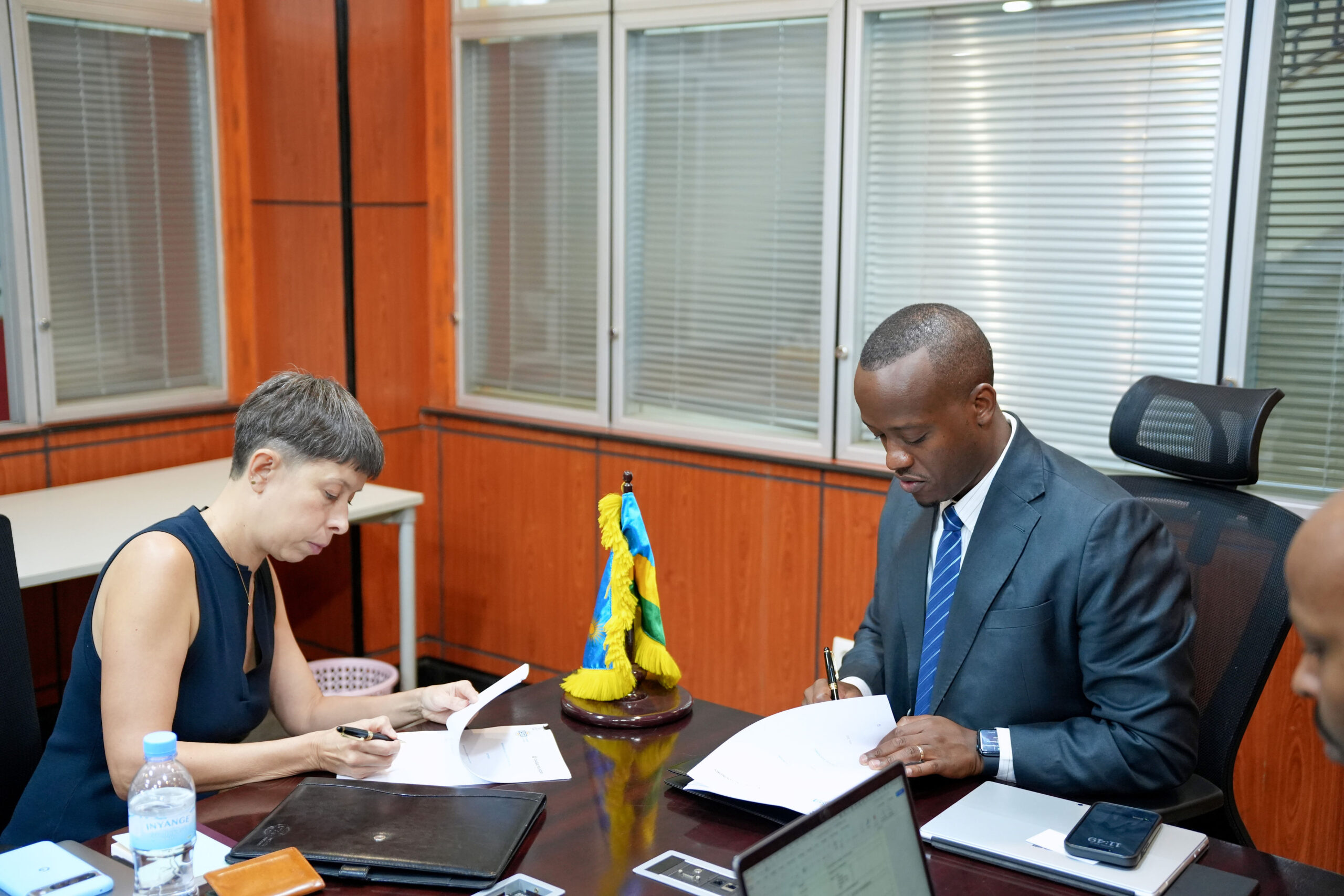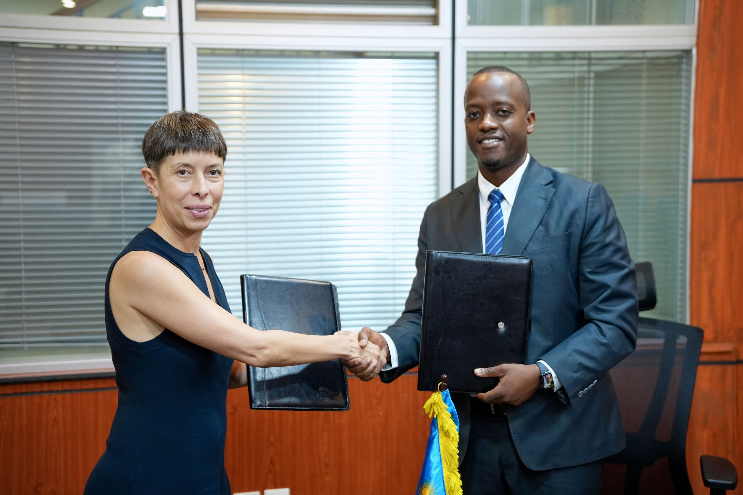 RSSB CEO Regis Rugemanshuro and Africa Perianez, CEO of Causal Foundry exchange documents after the signing