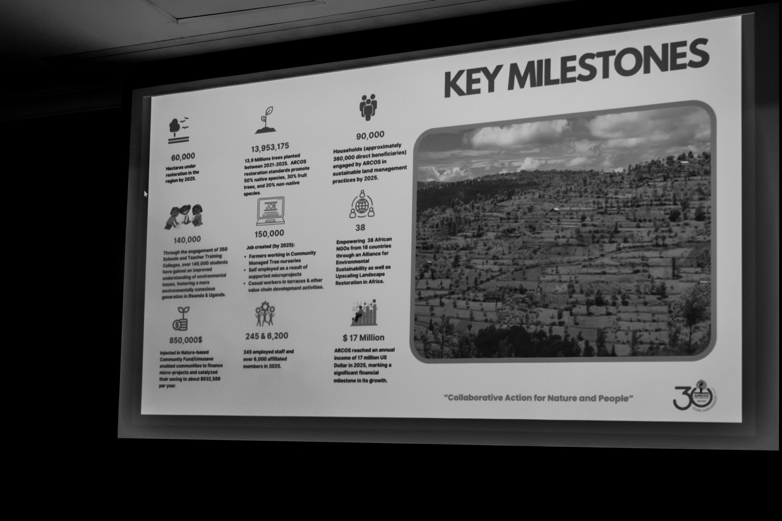 Over the past 30 years, ARCOS has delivered measurable and transformative results. The organization has planted and grown over 13.9 million trees, 60,000 hectares of land are under restoration, empowering 90,000 households, and supporting over 140,000 students from 350 schools through its Education for Sustainable Development programmes.