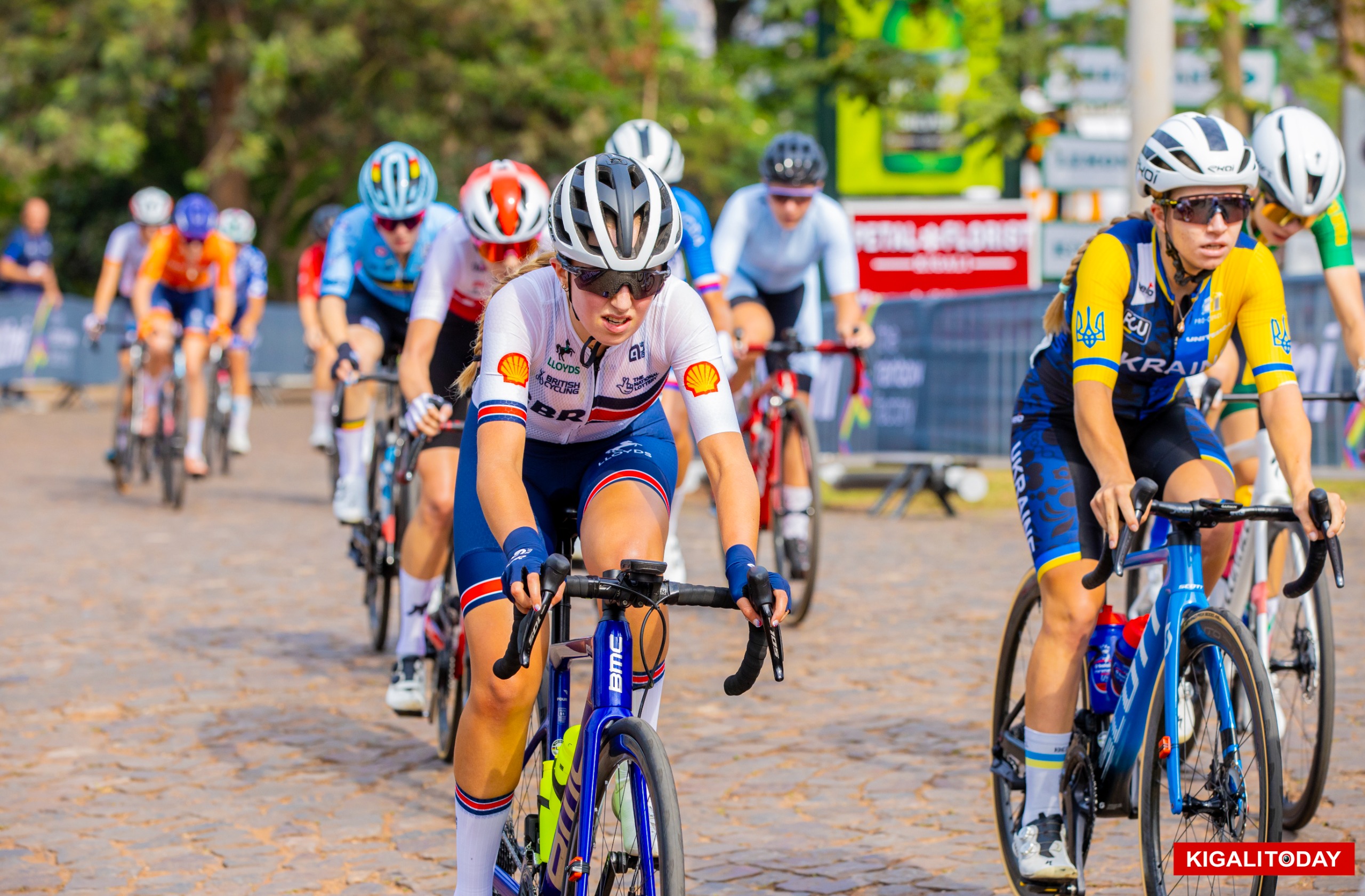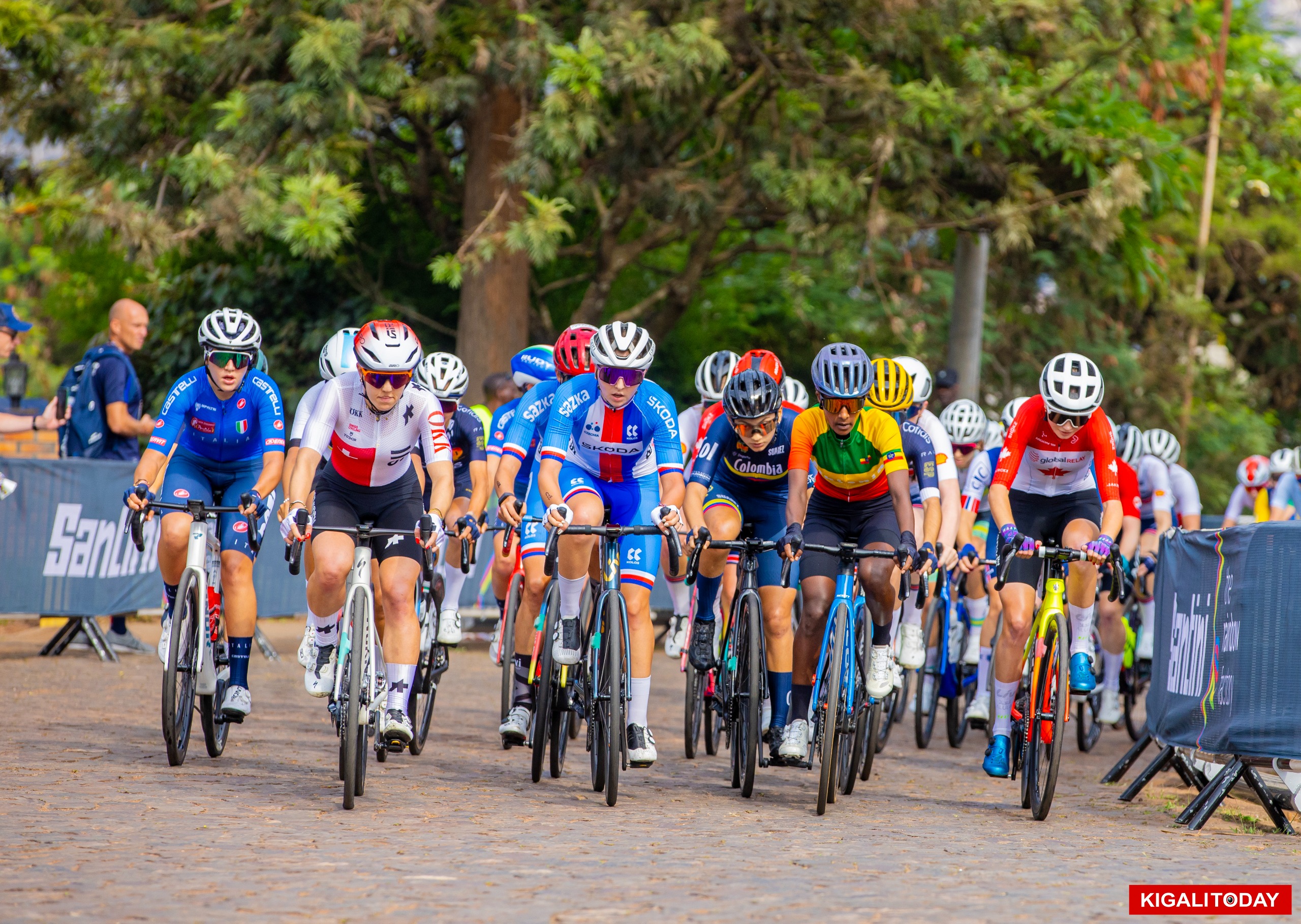 Ethiopian rider Tsige Kiros dropped seconds off the race when she encountered a mechanical issue before hitting the cobblestone road and was forced to double her energy to catch the peloton on the climb and retained competitiveness despite the hiccup.