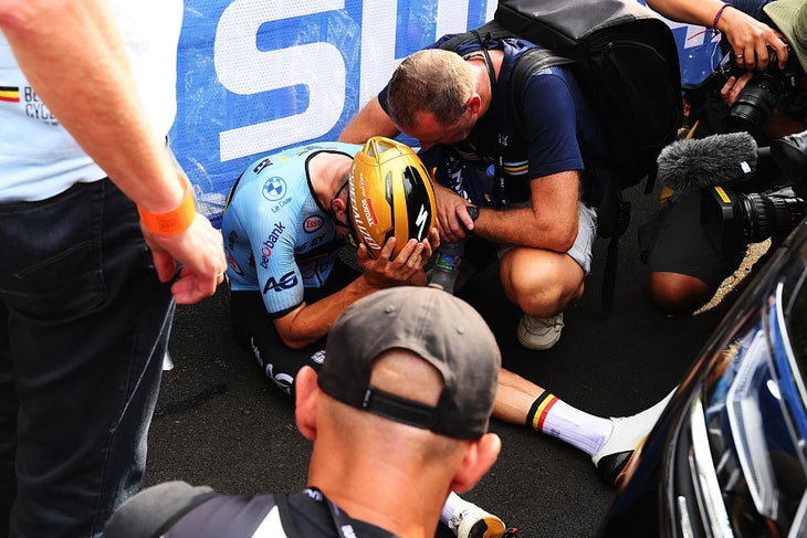 The smooth, powerful cadence that had secured his time trial world title just days before was gone, replaced by the jarring chaos of a broken bike and seizing muscles.