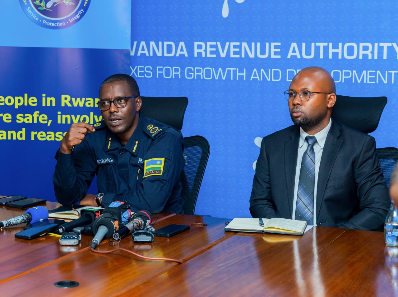 Police Spokesperson ACP Boniface Rutikanga (L) and Uwitonze Jean Paulin, the RRA Deputy Commissioner Tax Services and Communications, during the press briefing