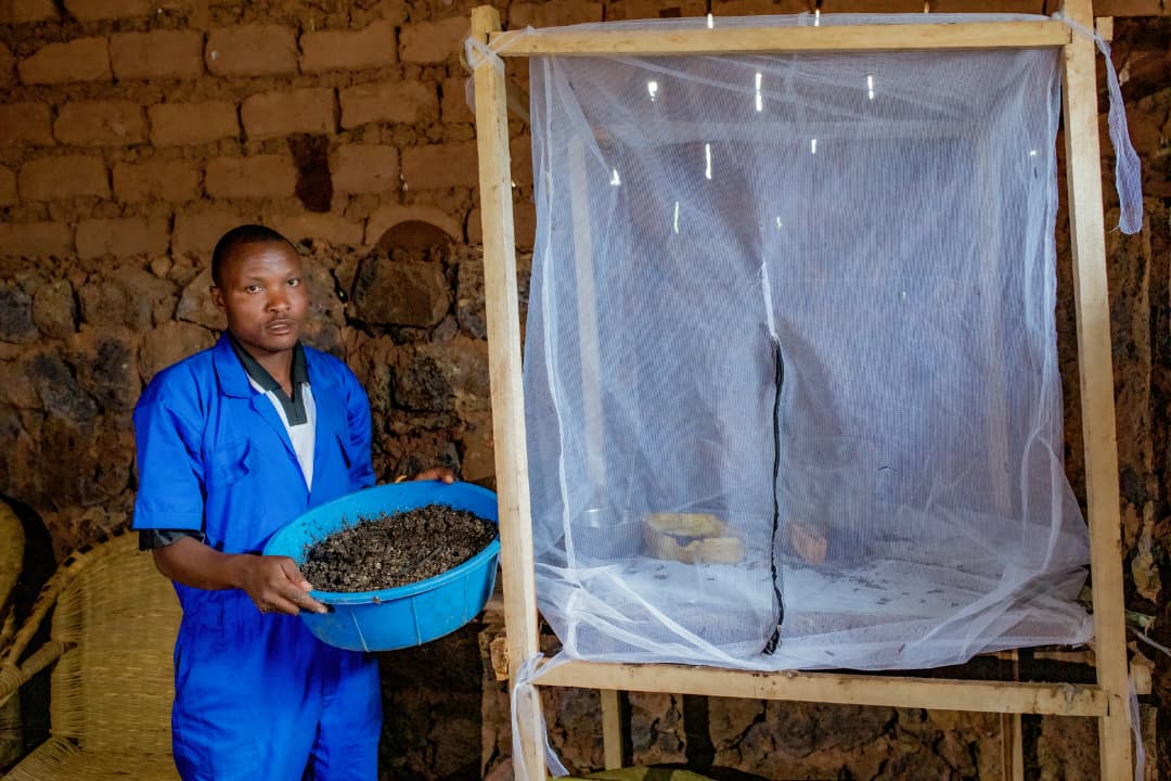 Jean Bosco Ntirenganya shows off the Black Soldier Flies net