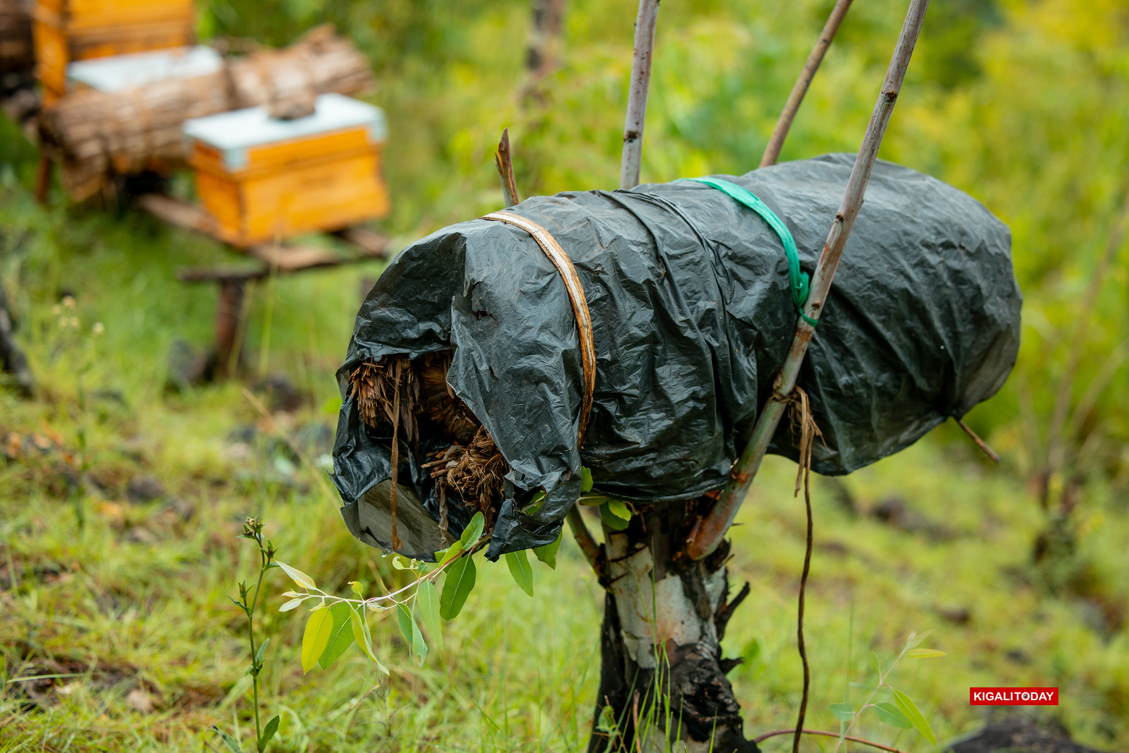 A covered beehive setup designed to shield colonies from harsh weather conditions demonstrates innovation in small-scale apiculture projects inside Nyabiheke.