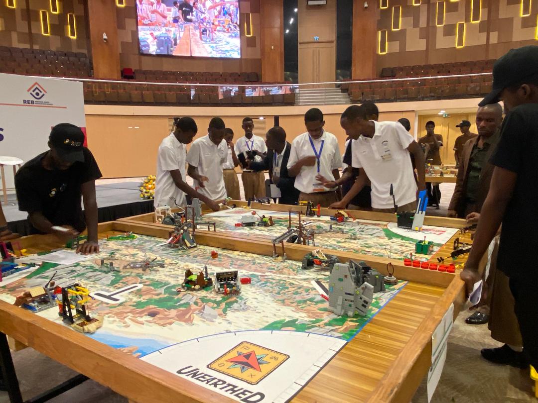 Robots navigate specially designed obstacles during the First Lego League competition at Kigali Convention Centre.