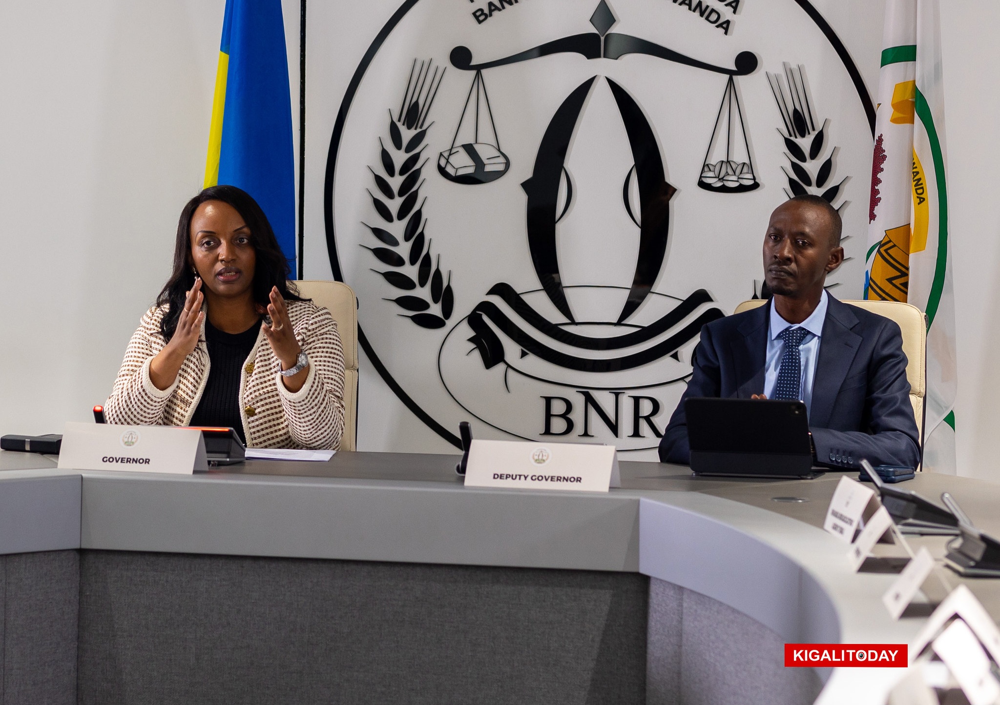 BNR Governor Soraya Hakuziyaremye (L) alongside the Central bank’s deputy Governor Nick Barigye, during the Monetary Policy Committee and Financial Stability Committee Press Conference held February 19, 2026