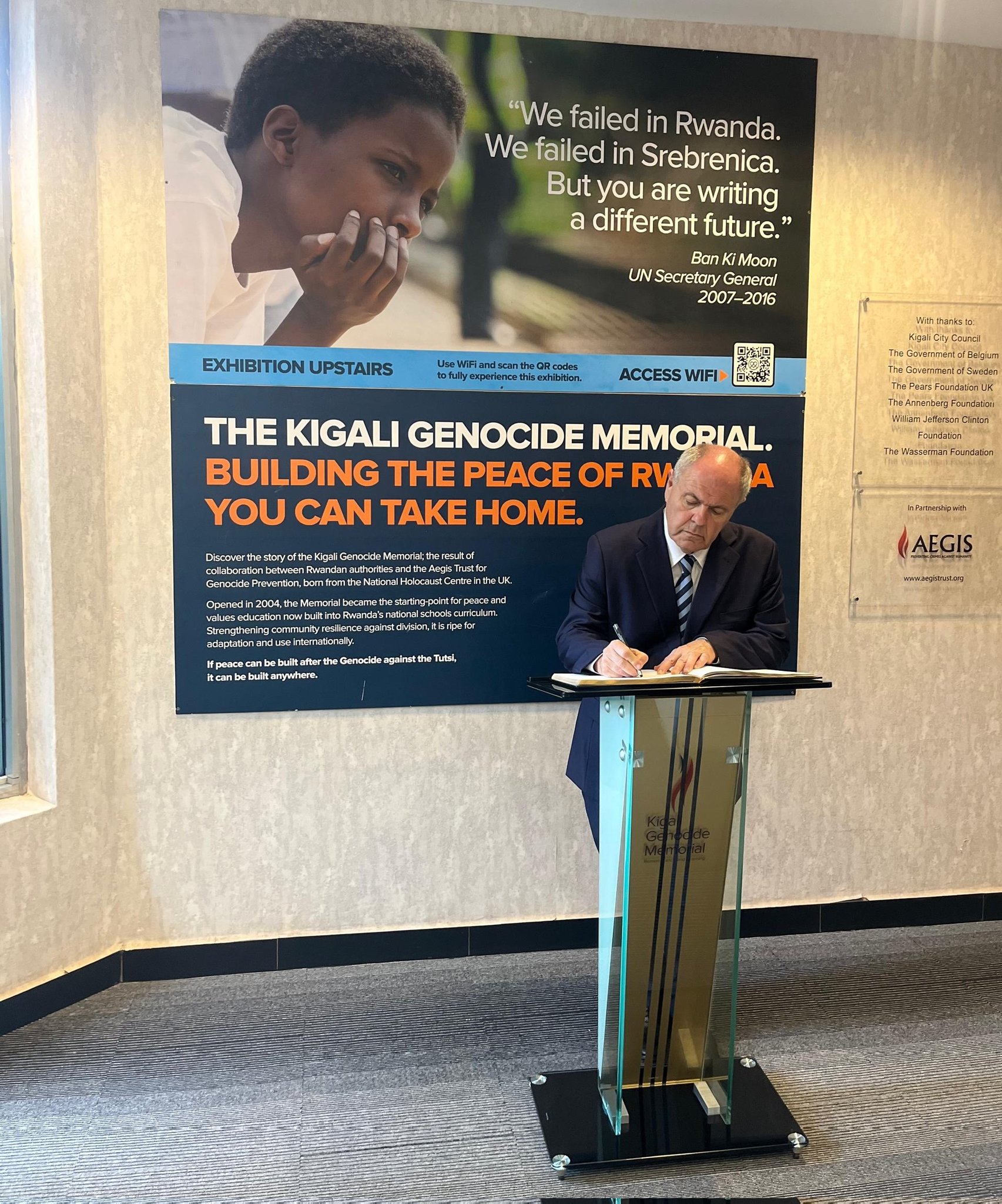 Dani Dayan, the chairman of Yad Vashem sign his stand point in a visitors book at Kigali Genocide Memorial site